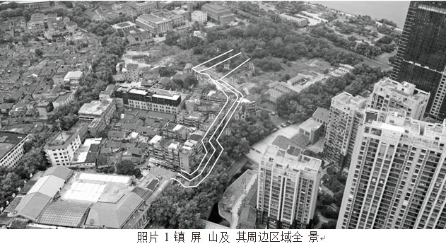 镇屏山:位于江苏省镇江市润州区大西路西端以北,迎江路以东、人民街以西、长江路以 南(图1) 。原为镇江北面临江边的一座小山,因犹 如屏障而得名,古称正平山。据元《至顺镇江志》卷九引刘宰《京口正平山平等寺记》云载:“正平山在京口城西一里。俗以正为蒸、以平为 饼。谓名以形立,若牛首、鸡笼然。甚矣!为山之羞也。按京口三面依山,阙其一以临大江。是山 峙于江岸,无峭幸之势,凭高而望,不倾不倚,式正且平。若巨灵恶洪涛之汹涌,遗此镇压。则名 固实之宾也,无微辞隐义。”
