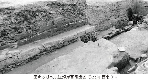2. 明代堤岸:以码头遗迹为界,分为东、西二段。东段,位千码头东侧,现已被晚期地层所破坏不存。西段,位 千 码 头 西 侧,距 地 表 深 度 约 2. 2 米,东 西 走 向,揭 示 长 约 23 米,残 高 约0. 7 2. 5米,底部宽约0. 6 米,顶部宽约0. 3 米。采用20 30 厘米的小块石垒砌,顶部用一层大块石封顶,壁 倾斜约50 ' 南侧(内侧 )为 黄 色 穷 土。其东端与码头西端相接,西端 呈弧形拐向南壁继续延伸(照片6 )