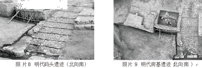 位于明代 堤岸之 间,距地表约 2- 4. 5 米,呈 南北走向,长10 米、宽3. 1 米,共分九层台阶,台阶 面均为卵石铺垫,顶部三层 台阶 ,每层 台阶 进深 1. 5 米,方向 北偏 东 30° ' 下 面六层台阶每层台阶进深0. 9 米,每层台阶高0. 1 米,方向 北 偏 东 20° ' 台 阶 顶 部 与底部之间落差2. 5 米。码头台阶两侧均有石头叠砌成防护墙,破坏较为严 重(照片 8 ) 。