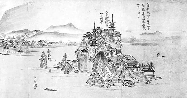 日本画僧的金山图(明早期),明成化年间(1469 年), 日本雪舟《唐土胜境图》之金山图,现藏日本京都国立博物馆。