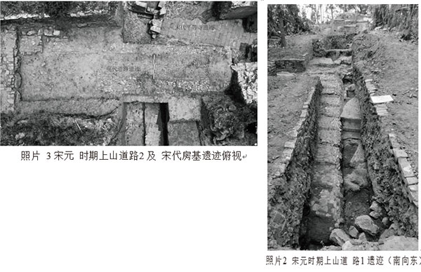 便道,位千主路东西两侧,均采用小块石、残砖铺设(残砖 铺设推测是后期补缺修复所用),便道外侧边缘竖向立铺 一道残砖作为路牙压边。根据考古地层叠压关系分析,道 路1 之下为自然岩石,而道 路2 之下为宋元时期地层,因镇屏山上未发现有早于宋元时期的遗物、遗迹,山此推测 这两条道路遗迹时代应不晚于宋元,虽然在营造形式上有所不同,但 方 向、宽 度 基 本一致,可以 认 为 均 是 宋元时期上山的主要干道(照片3 )。