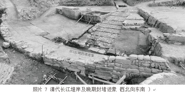 此外,在清代堤岸对应码头的位置,有明 显的 石块封堵 迹 象 ,长5. 4 米、宽约1 米、残高1. 6 米。由此推测,清代早期码头仍在使用,晚期由于长江淤涨加速江水畏缩,使码头失去功能,于 是将码头开口封堵成墙与清代堤岸融为一体(照片7 )