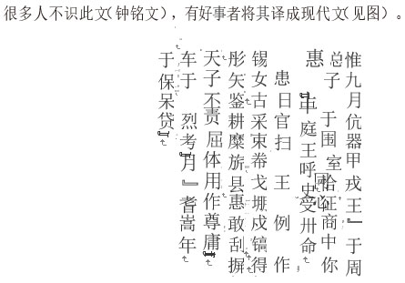 古有好事者将“钟铭文“译成“现代文字”,然没有标点符号,还是读得不顺畅,为此,笔者将“现代文字“添加标点符号,以飨读者。