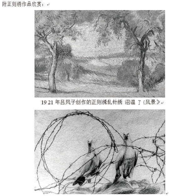 事实 上,吕凤子是正则绣(乱针绣)的第一位创作者。1991 年吕存曾与北大历史系老教 授、文物出版社资深编辑拜访全国妇联书记处书记、全国人大代表胡耐秋女士(丹阳人,正则 学校的学生),据她回忆证实:1921 年上半年,我读高二下半学期,大约是五六月间,吕先生在家乡。有一天下午杨守玉先生在我们班上美术课。吕先生来向杨先生要针,说针丢了。他左手 拿着一个七八寸直径的竹圈绷子,上面用蓝绿色的丝线纵横交错地绣了一小块未成形的图 案,好像是风景。杨先生拿了一根针给吕先生,吕先生走回他的办公室。杨先生对我们说:"吕先生在试做一种新绣法,叫乱针绣,我们听了大为惊奇。”所以,杨守玉创立乱针绣的说法是不科学的,也是 没有经过认真考证的。正则绣(乱针绣)是从西画中来 ,而不是从刺绣中来。它使迄今已百年历史的正则绣(乱针绣),是 以 针为笔,在织物上运用线的色彩,在绘画观念作用下完成对物体形象塑造的。吕风子在《乱针绣谈》一文中这样说道:“我们平H 且有这样的信念,以为凡是用线和色构成的,无论在何种物面上,总会直接用线和色来表示属于物理和心理 两方面的力 。那么,就用构画的线和色来构绣,有谁说不可?所以我们就毫不踌躇,径用构画的方法来构成我们的乱针绣了。”